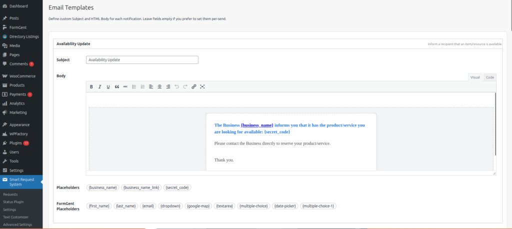 Availability NotificationSent when the Availability Update action is performedNotifies the user that the item/service is availablee.g ( {fullname}, {business_name}, {secret_code}, {entry_id} )