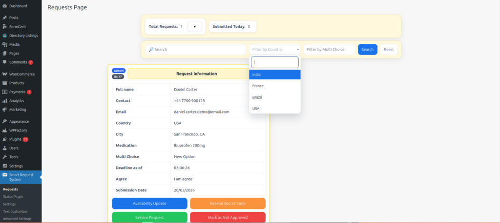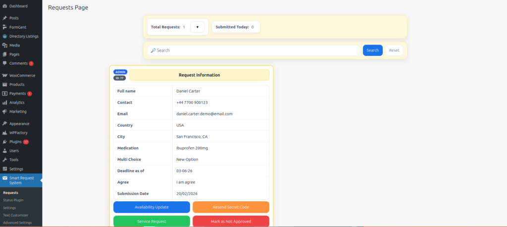 The Requests Page provides a centralized view of all user submissions collected through the Smart Request System. Once a request FormGent form ( Smart Request System Form ) is submitted , the entry becomes visible under Smart Request System → Requests within the WordPress admin area.
